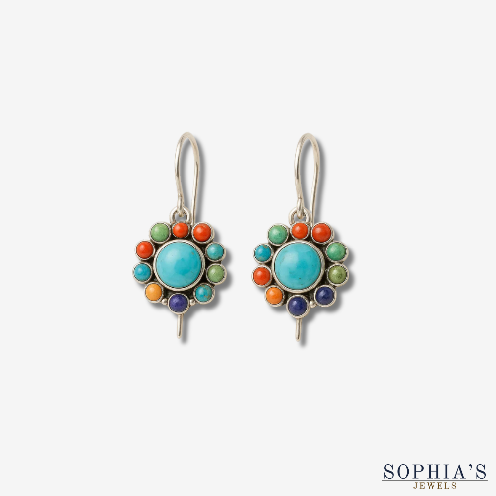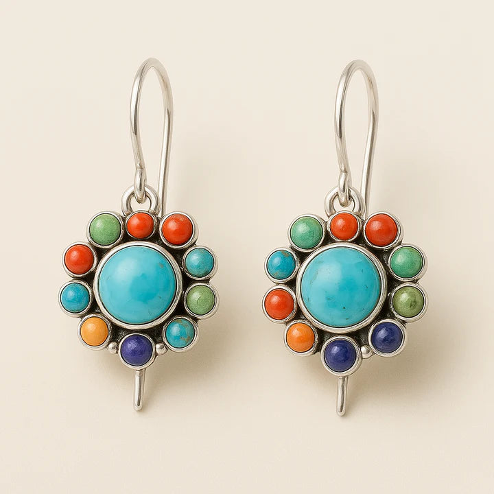 These eye-catching earrings feature a blend of multicolored turquoise tones set in a classic round design. With their natural textures and bold hues, they bring a lively, bohemian touch to any outfit.