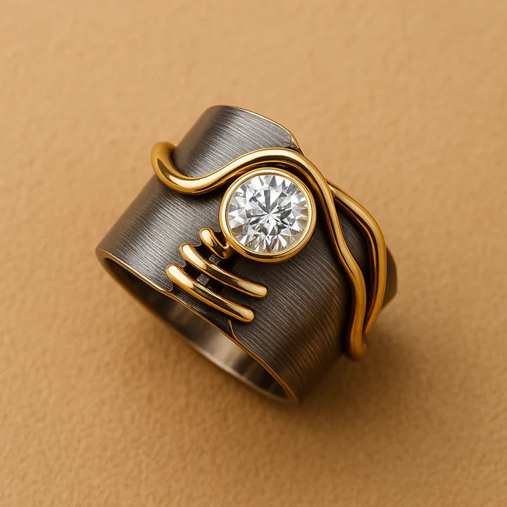This striking ring features a deep-toned silver band paired with a radiant zirconia stone, blending vintage elegance with a bold edge. Its moody metallic finish and classic sparkle make it a standout piece for any occasion.