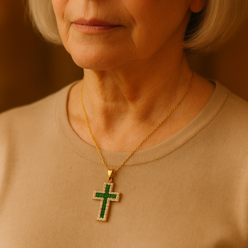 The Solene Emerald Cross Pendant Necklace is a delicate harmony of faith and fashion. Featuring radiant emerald-green stones arranged in a timeless cross silhouette, this pendant is framed in warm gold for a rich, elegant finish. A piece that symbolizes strength, serenity, and enduring beauty.