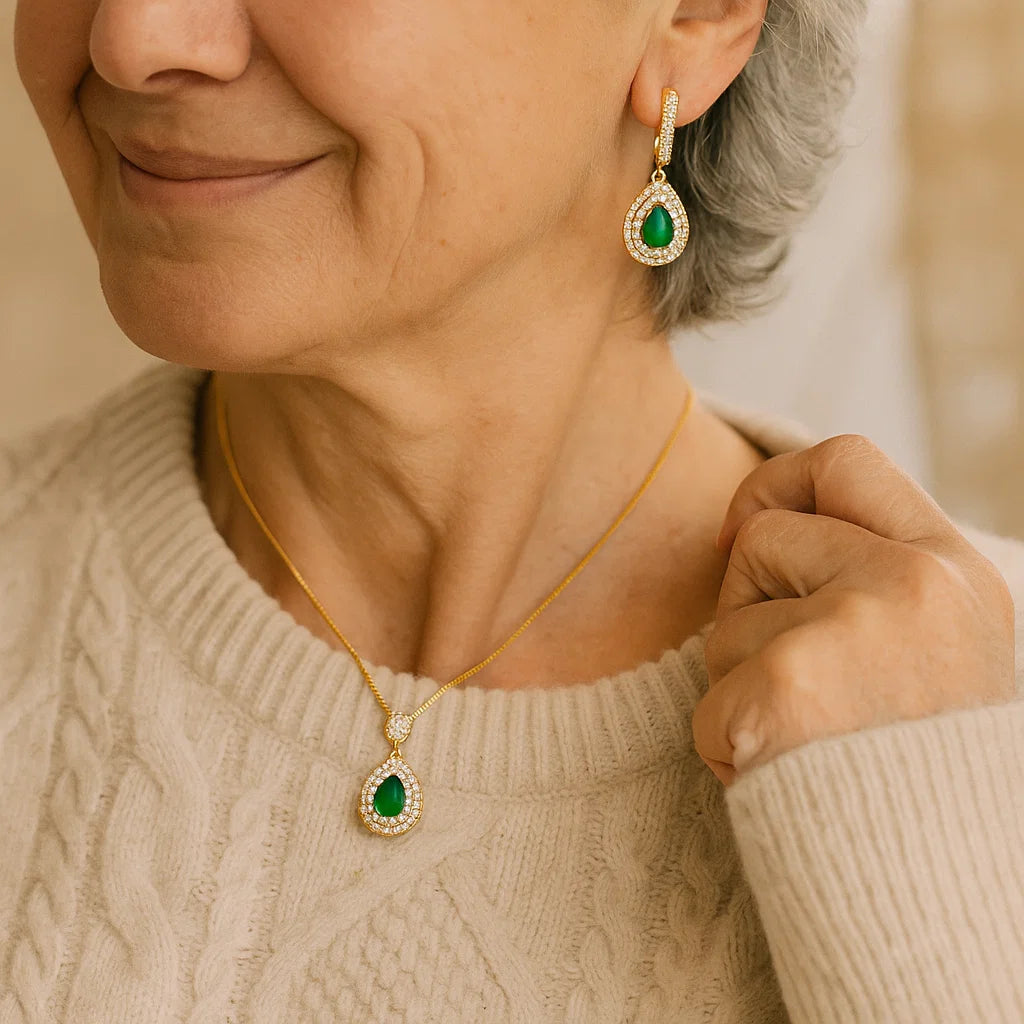 The Thalienne Aurevelle Jewelry Set enchants with its luminous emerald water-drop zircon stones, carefully cut to reflect light with a captivating brilliance. Framed in polished gold, the necklace and matching earrings embody sophistication and timeless beauty, perfect for elevating both evening ensembles and special occasions.