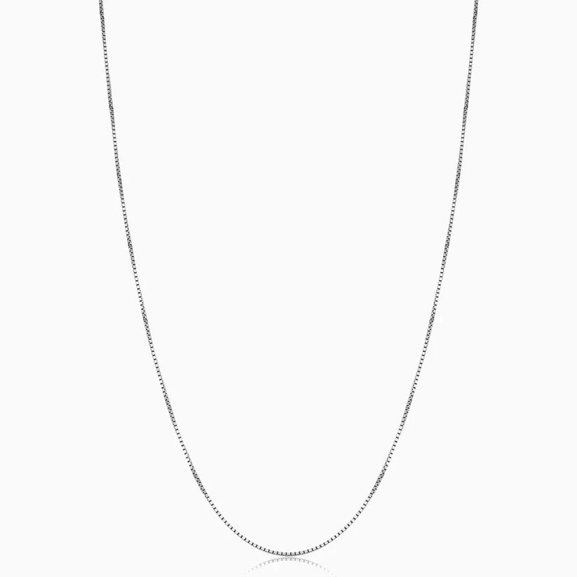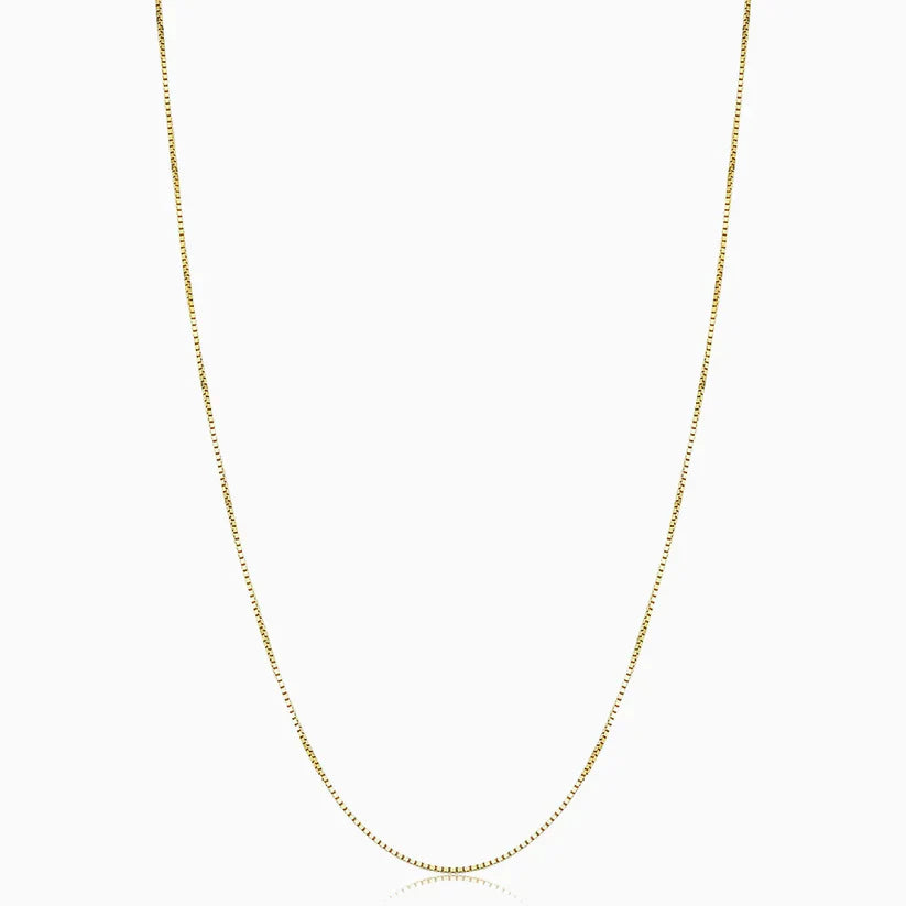 The Bodega Box necklace features a polished box chain, offering a minimalist yet refined look. Durable and versatile, it’s a timeless piece that works perfectly on its own or layered.