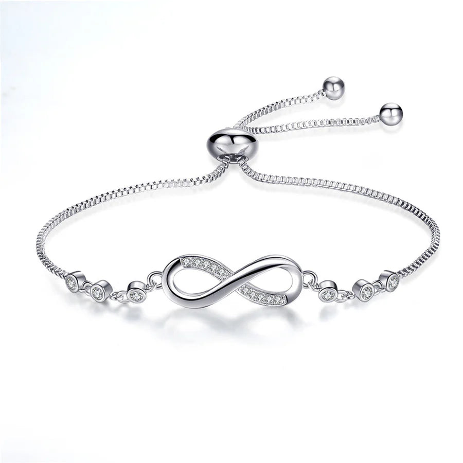 Symbolizing endless love and connection, this adjustable silver bracelet features a smooth infinity charm and a sleek chain. Its minimalist design makes it perfect for everyday wear or layering with other favorites.