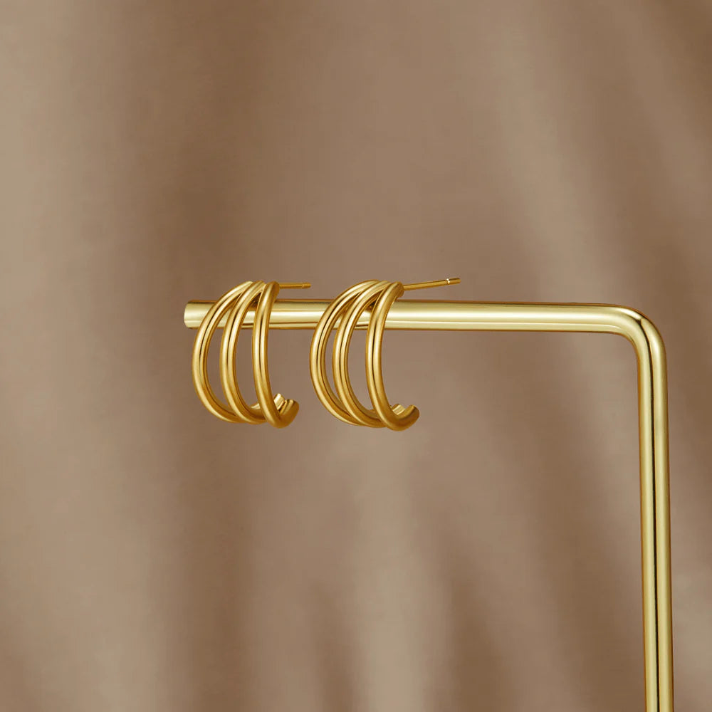 A modern take on a timeless classic. The Anaya Earrings feature a layered triple-hoop design that gives the illusion of a stacked look — all in one sleek, lightweight piece. Crafted in 14k gold-plated stainless steel, these hoops are waterproof, tarnish-free, and made to shine every day.