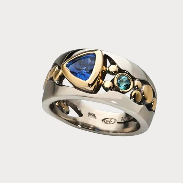 The Blue Waltz ring showcases a deep blue crystal set in an ornate vintage-style band. Elegant and full of character, it captures the charm of a timeless waltz in shimmering detail.