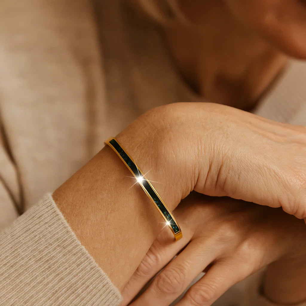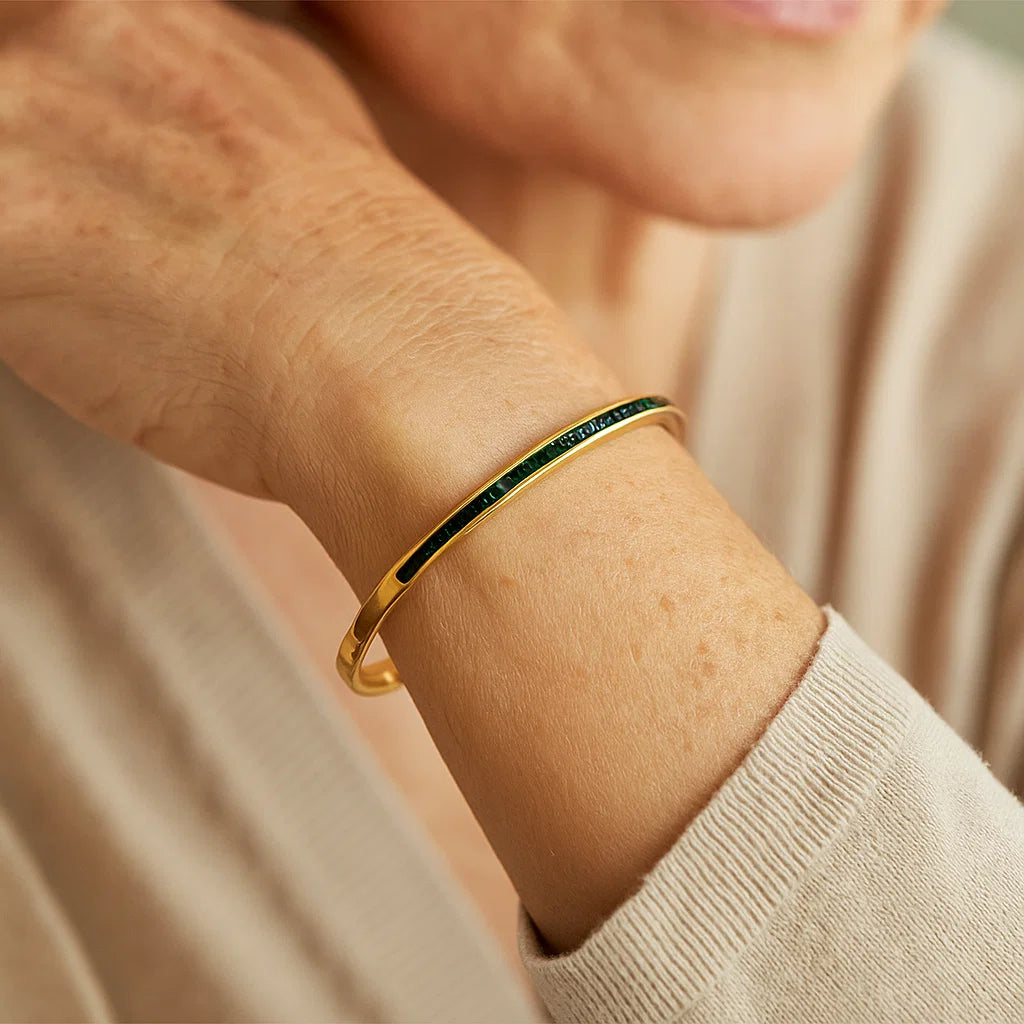The Celeste Viride Bracelet combines the richness of gold with a soft, nature-inspired design. Its smooth curves and radiant finish bring effortless elegance to any ensemble.