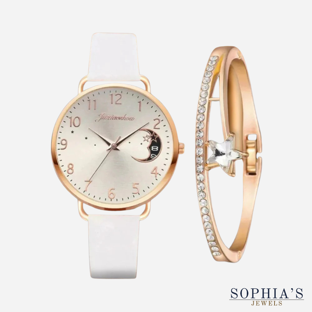 This moon-inspired dial wristwatch set offers a stunning design paired with reliable quartz precision, ideal for any occasion. With its moon-inspired dial and elegant leather strap, this watch exudes sophistication. The matching strap adds a touch of glamour, making it perfect for casual or formal events.