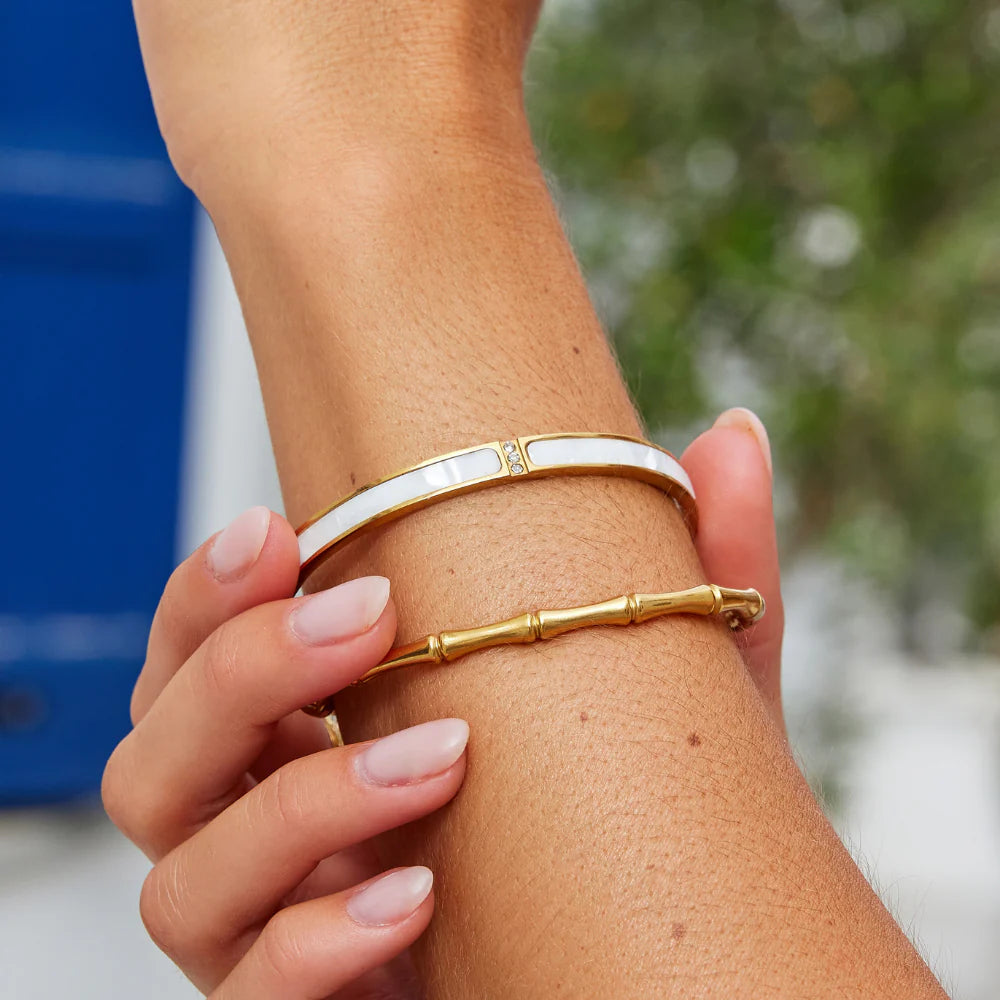 Minimal with a bold edge. The White Sahara Bangle combines sleek gold plating with a smooth white enamel finish, creating a crisp, modern look that stands out solo or stacked. Crafted to be waterproof and tarnish-free, it's designed for lasting shine and everyday elegance.